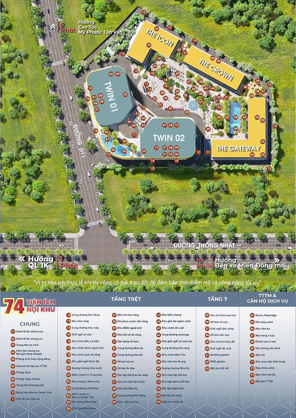 Kết nối giao thông thuận tiện: Từ dự án, cư dân chỉ mất khoảng 15-20 phút để đến trung tâm quận 1 qua Xa lộ Hà Nội hoặc các tuyến đường lớn như Phạm Văn Đồng. Ngoài ra, tuyến đường Thống Nhất cũng kết nối trực tiếp với các khu công nghiệp lớn như KCN Sóng Thần, KCN VSIP, tạo điều kiện thuận lợi cho các chuyên gia và người lao động làm việc trong khu vực.