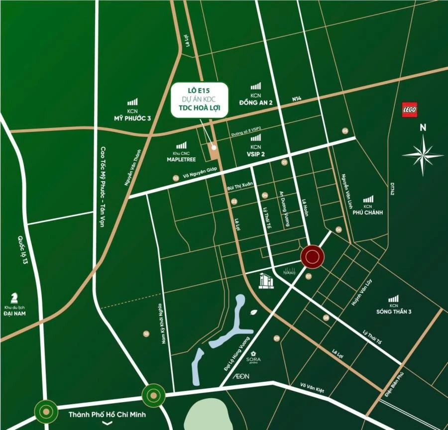 Bên cạnh đó, Lô E15 còn liền kề hàng loạt khu công nghiệp lớn và năng động như VSIP II, Khu công nghiệp Mỹ Phước, Mapple Tree và Đồng An 2, tạo điều kiện thuận lợi cho việc phát triển các hoạt động thương mại, dịch vụ và dân cư, đồng thời thu hút lực lượng lao động và chuyên gia đến sinh sống, làm việc.