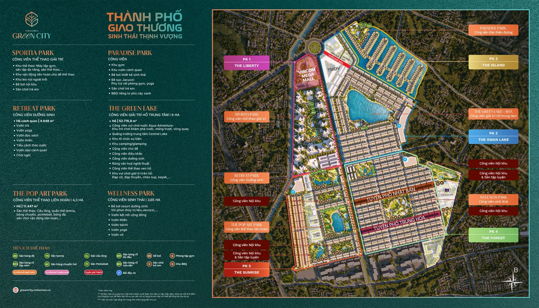 | Tiện ích nội khu | Trung tâm thương mại Vincom, bệnh viện Vinmec, trường học Vinschool, hồ trung tâm The Great Lake & Swan Lake 10 ha, công viên xanh & thể thao đa năng, sân tennis, gym, spa & yoga, khu BBQ, đường chạy bộ, thang máy Face ID, an ninh 24/7, Vinbus, Vinmart |