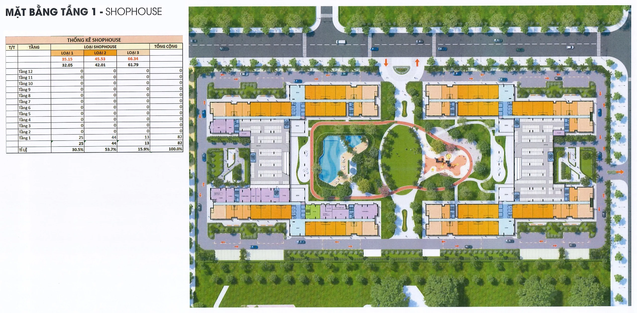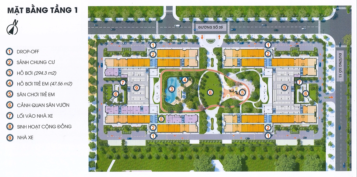 | Tiện ích | Công viên 2.4ha, hồ bơi, khu vui chơi trẻ em, trường mầm non, tiểu học, trung tâm thương mại, shophouse, sân bóng đá, sân tennis |