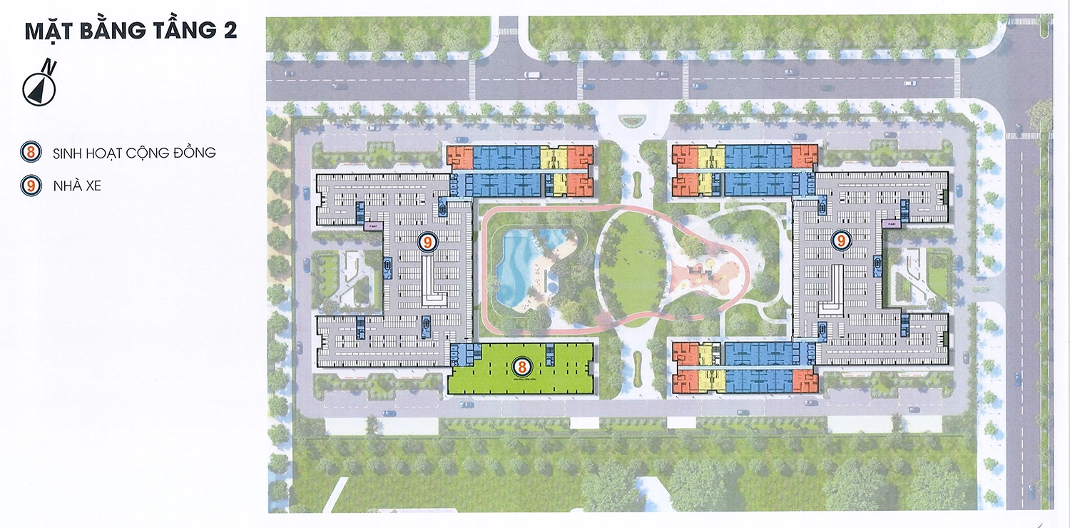 Tầng 2 có diện tích sàn 8.818,82m². Bố trí 36 căn hộ diện tích từ 33,26m² đến 62,33m², nhà để xe máy diện tích 5.005,67m², sảnh thang máy, phòng sinh hoạt cộng đồng và các phòng kỹ thuật phụ trợ tòa nhà.