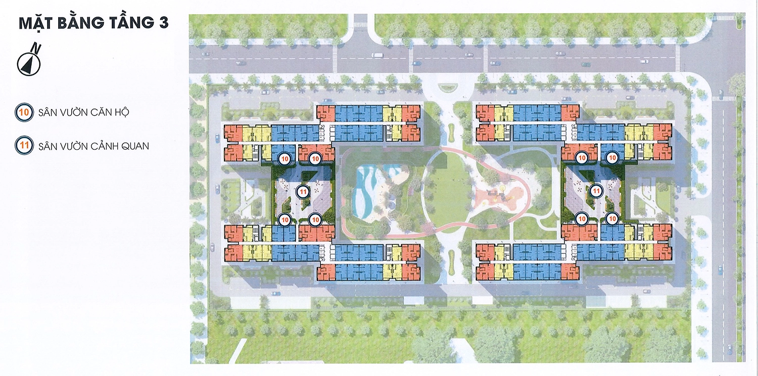 Tầng 3 có diện tích sàn 8.766,45m². Bố trí 100 căn hộ có diện tích 33,26m²/căn đến 62,33m²/căn. Trong đó, sân vườn trên mái diện tích 2.179,49m², sảnh thang máy và các phòng kỹ thuật phụ trợ tòa nhà.